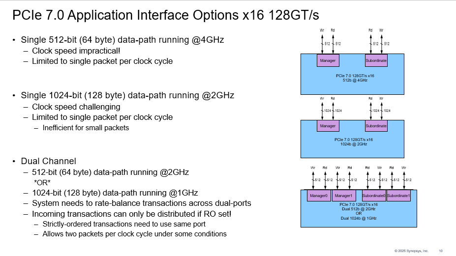 The real challenge with PCIe 7.0 may not be in the links, but in the link managers. “It’s harder and harder for devices to satisfy [bandwidths] with sort of one agent internal, like within an SSD. You’re going to need multiple channels or multiple data movers to sustain the full data rate.” As with so many connectivity schemes, running one link fast is tempting, but designing a chip with more application interfaces spread out at lower clock speeds is less risky. His example cites moving from an unsustainable 512-bit path at 4 GHz to a dual-ported 1024-bit path at 1 GHz.