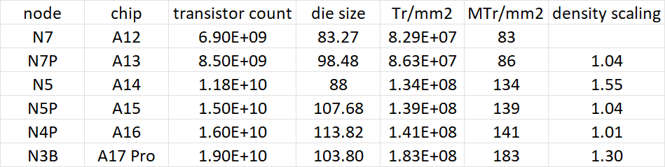 So the Bionic chip density scaling rate is lower at beginning of N3 compared to beginning of N5.