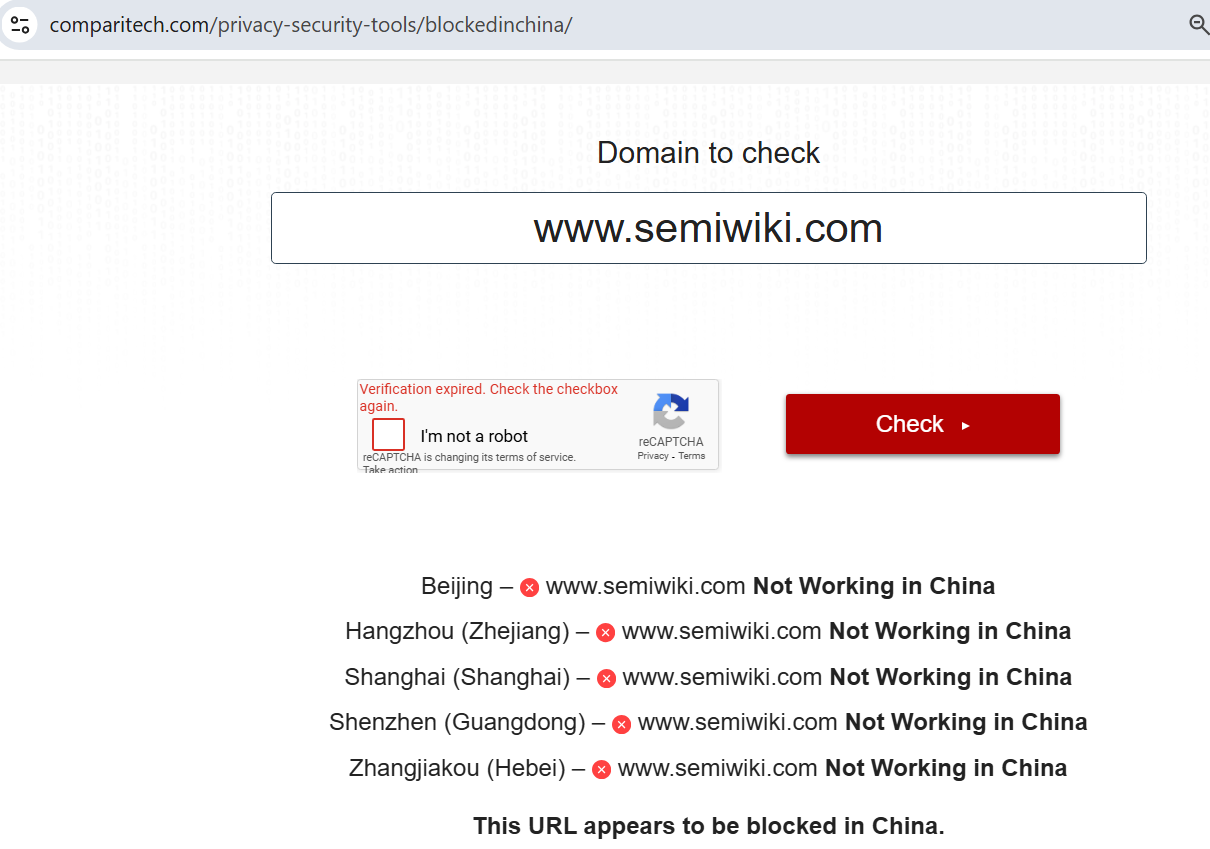 I just did a quick check to see whether semiwiki.com is blocked by the CCP/PRC. The good news is that semiwiki.com is now regarded with prestige similar to CNN, Wall Street Journal, The New York Times, Fox News, ABC, NBC, CBS, Facebook, X, and Google, all are blocked by China. :)