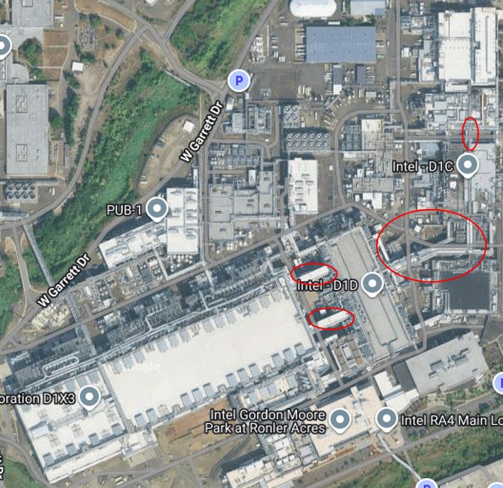 While Oregon has multiple fabs, they are in essence all really one big fab. While kind of hard to see exactly the red ovals in this picture show links connecting the clean rooms.