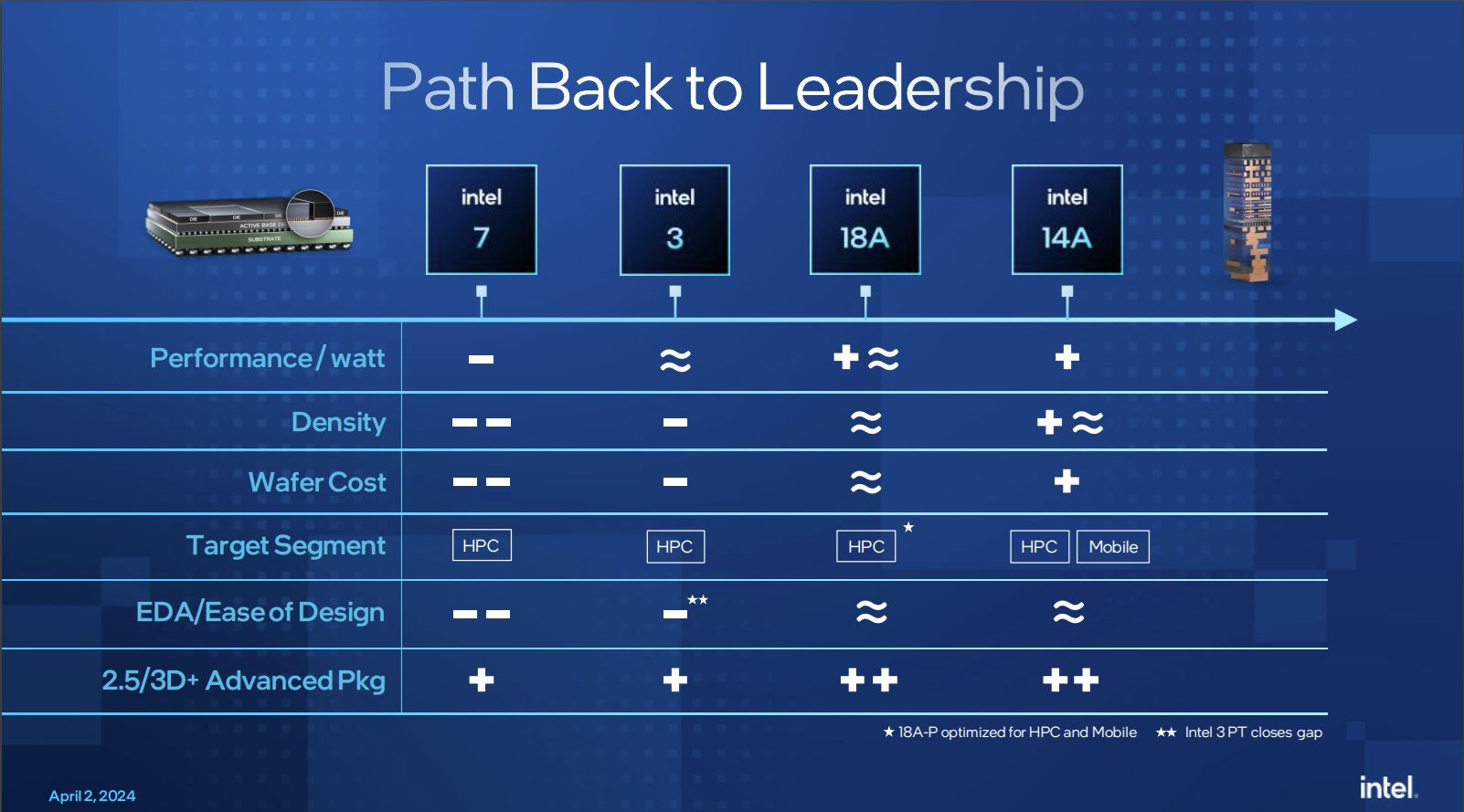 This is the most interesting slide. The dash means Intel is behind, the squiggles means Intel is comparable and plus means ahead. They don't say who the comparison is with but clearly it is TSMC. They key here is the Target Segment, so this is in terms of HPC. As far as performance goes I agree with this graphic but not performance per watt. I have a problem with wafer cost especially when yield is involved. I also do not agree with the 18A density comparison, if we are talking about TSMC. Samsung 2nm maybe, TSMC N2 no. EDA ease of use I can agree with since Intel is a big EDA customer but TSMC has the biggest EDA/IP ecosystem. Packaging is still a wait and see for me. Intel and Samsung are not doing packaging HVM for foundry customers as of yet in comparison to TSMC. On paper maybe but foundry HVM is a different deal altogether.