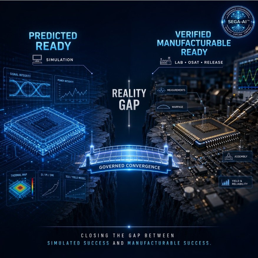 The Reality Gap is the structured delta between Predicted Ready and Verified Manufacturable Ready. On one side sits design intent, simulation confidence, and correlation optimism. On the other sits physical evidence, lab behavior, assembly variation, stress response, yield exposure, and release consequence. The dangerous assumption is that these two states are naturally close. In advanced-node systems, they often are not.