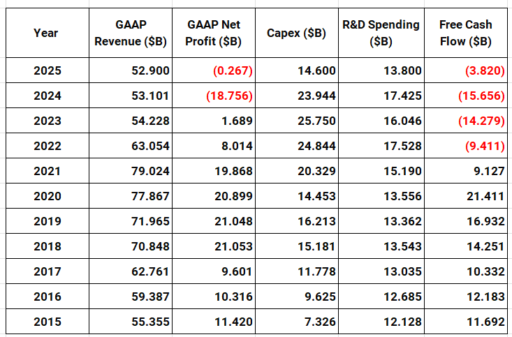 $93.545 billion in R&D from 2020 to 2025 end up with shrinking revenue, net losses, and negative free cash flow in a market that’s booming? Even worse, according to last week’s earnings call, Intel admitted it still can’t produce enough of the products customers actually want to buy, despite six years of massive capital spending. Something is very wrong.