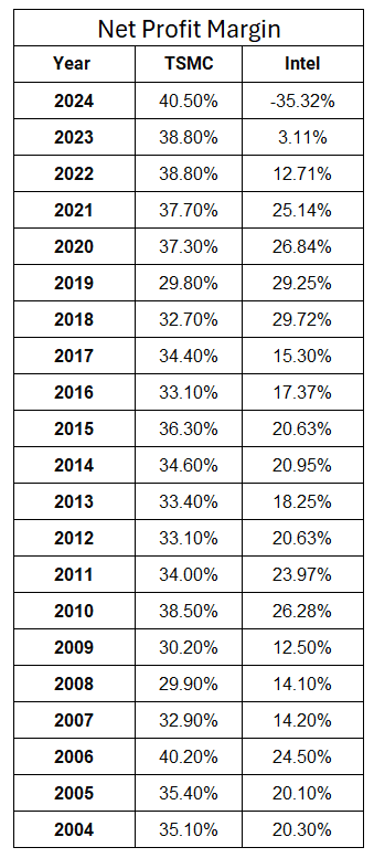 TSMC vs. Intel annual net profit margins (2004–2024)