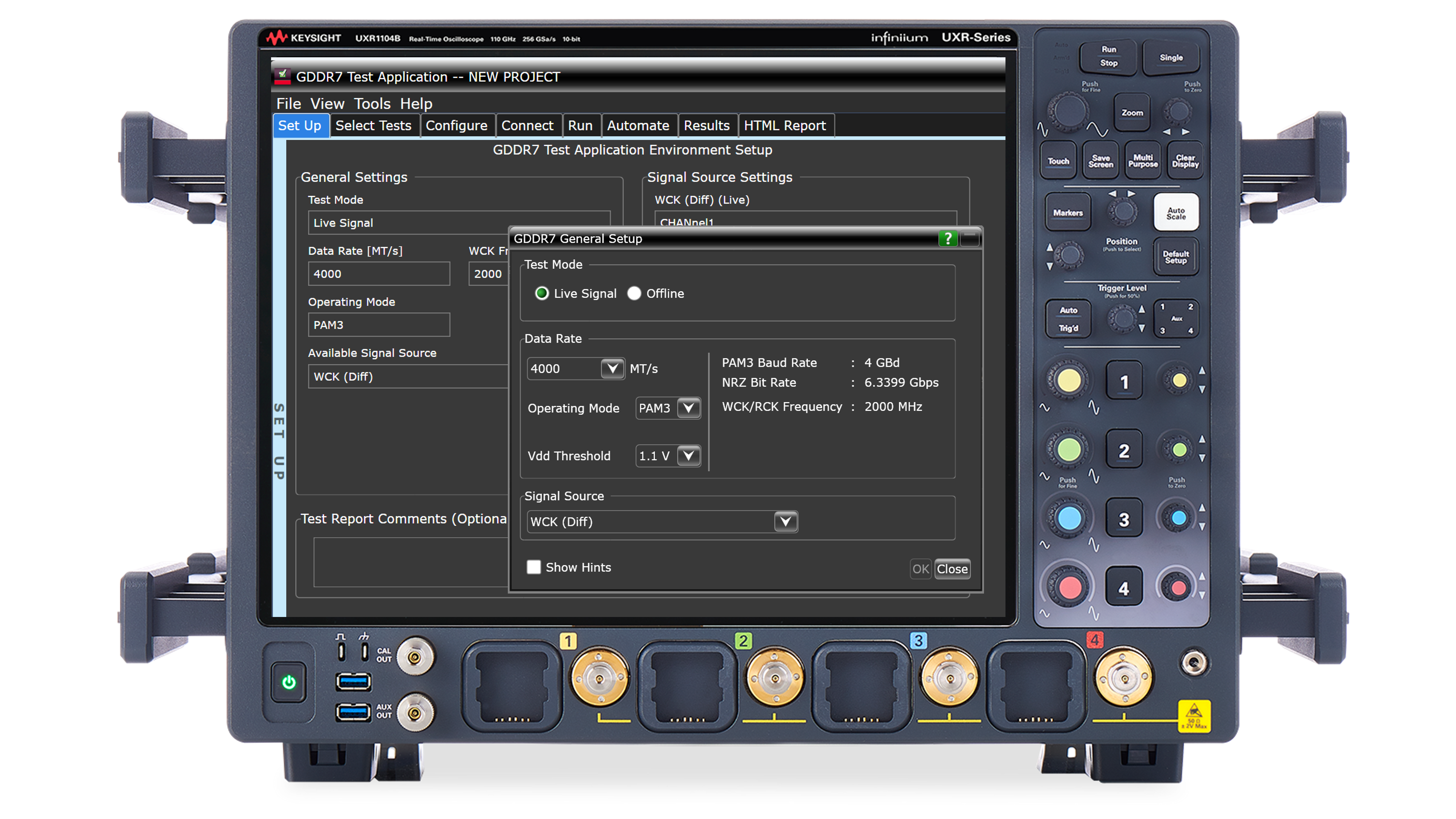 The D9370GDDC GDDR7 transmitter compliance test software running on a Keysight UXR oscilloscope accelerates transmitter testing by automating compliance validation, enabling faster and more accurate test results.