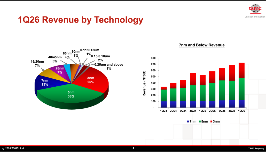 In the first quarter, shipments of 3-nanometer accounted for 25% of total wafer revenue; 5-nanometer accounted for 36%; 7-nanometer accounted for 13%. Advanced technologies, defined as 7-nanometer and more advanced technologies, accounted for 74% of total wafer revenue.