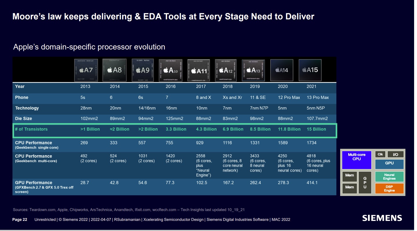 If you want to talk about semiconductor scaling talk to Apple. They put their money where their scaling is. Graphs and charts from foundries or analysts are fine but this is where the rubber meets the road, absolutely. From 1B transistors in 2013 to 15B in 2021 is simply amazing!